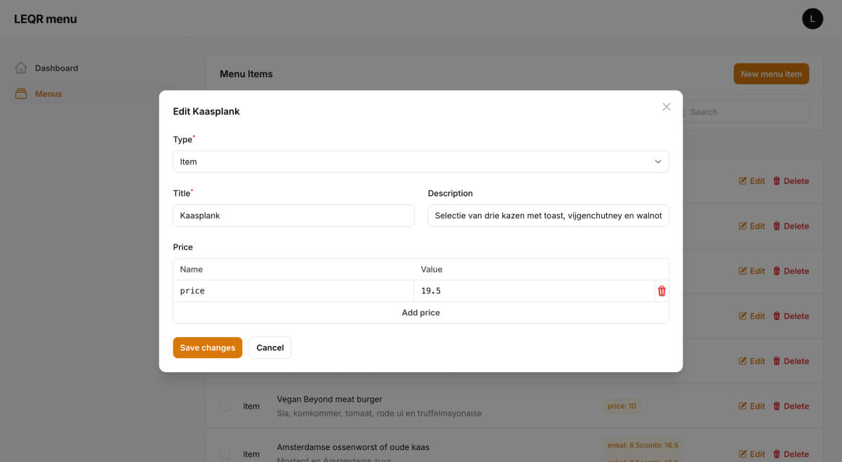 Je kunt je menu zo vaak aanpassen als je wilt. Voeg nieuwe gerechten toe en pas prijzen of beschikbaarheid van items aan. Je gasten zien altijd de laatste versie.